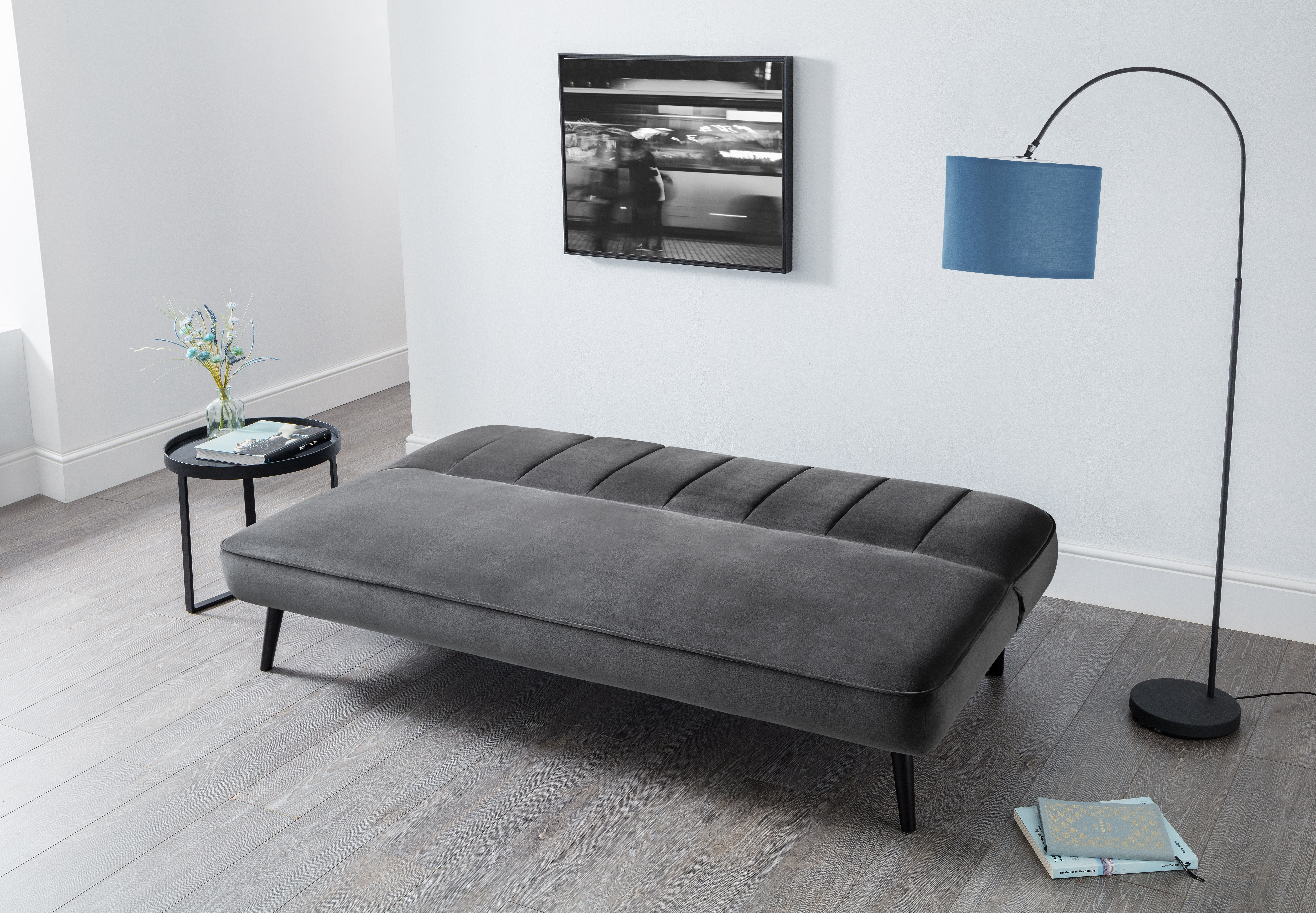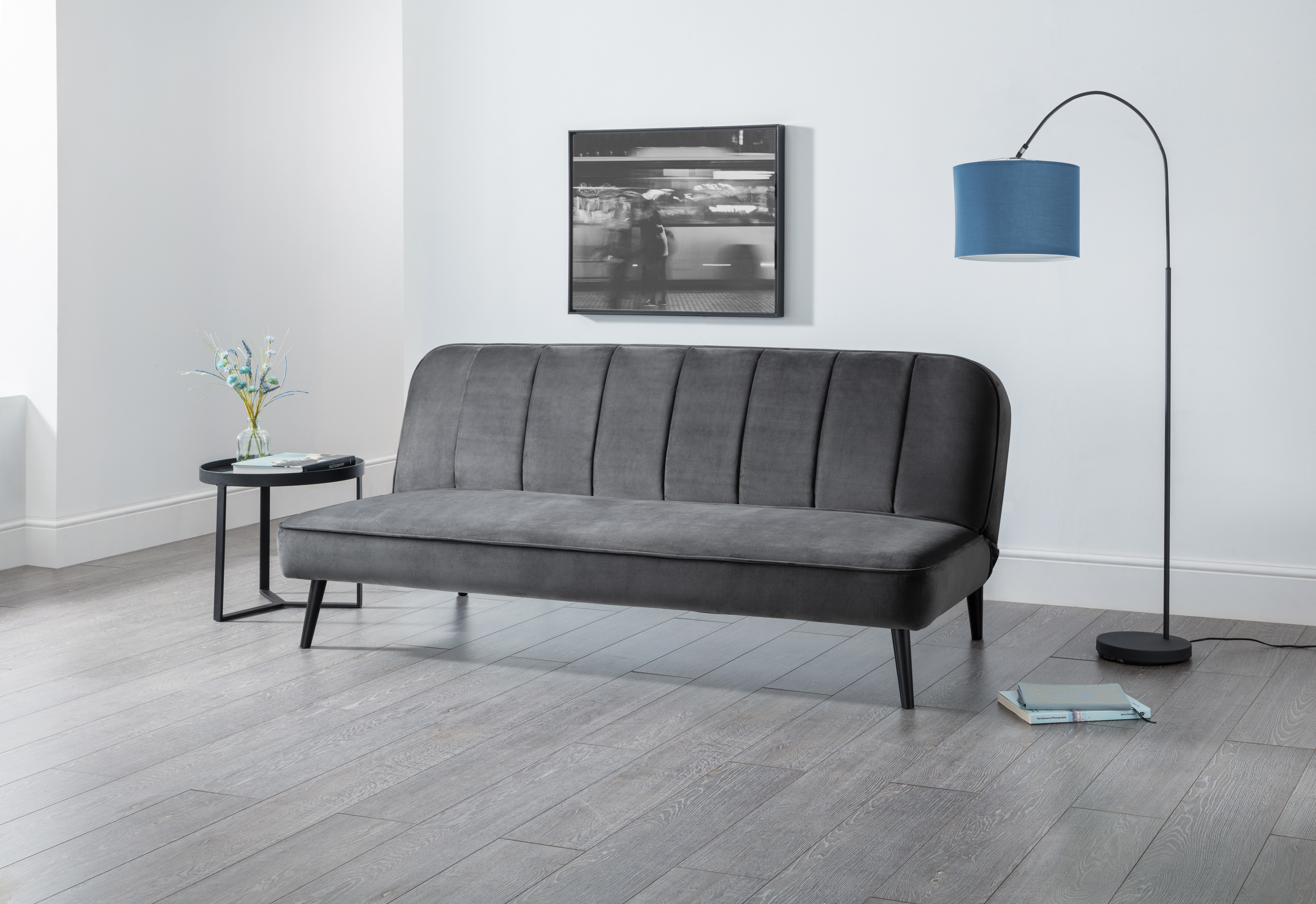 This minimalist, retro-inspired sofabed is compact and functional with an easy click-clack design. Upholstered in a luxurious grey velvet, featuring a beautiful curved back and scallop detailing with tapered black legs, this sofabed will suit a range of modern interiors.